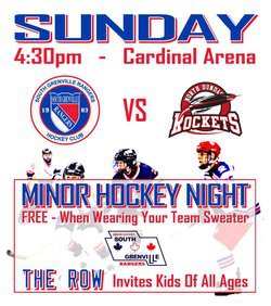The South Grenville Rangers are back in action next weekend, matching up with The Inferno again on the road next Saturday before returning home to host the North Dundas Rockets on Sunday. The puck will drop for Sunday’s game at 4:40pm on Minor Hockey Night. The ROW invites kids of all ages to attend and show our SGR pride, and kids get in free when wearing their team sweaters! - Liam Manderville