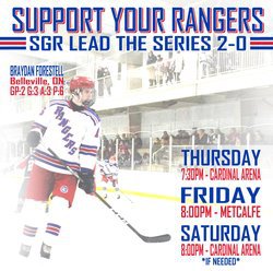 The blue, red, and white look to continue their hot streak on Thursday night at home, with a 7:30 game three puck drop at the Ingredion Centre. Come out and show your South Grenville Rangers support! #PackTheTrack – Liam Manderville